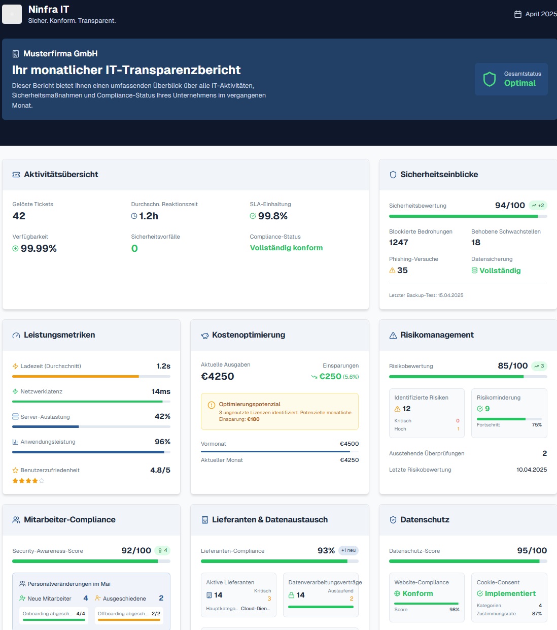 Unternehmen erhalten mit Ninfra keine isolierten Einzellösungen, sondern einen verlässlichen Partner, der IT und GRC prozessorientiert betreibt und weiterentwickelt. Unsere Services sind modular, sodass Unternehmen gezielt Unterstützung dort erhalten, wo sie sie brauchen – von einzelnen Betriebsaufgaben bis hin zur vollumfänglichen Betreuung. Das reduziert den internen Koordinationsaufwand, ermöglicht reibungslose Abläufe und stellt sicher, dass Richtlinien nicht nur definiert, sondern auch operativ umgesetzt werden.